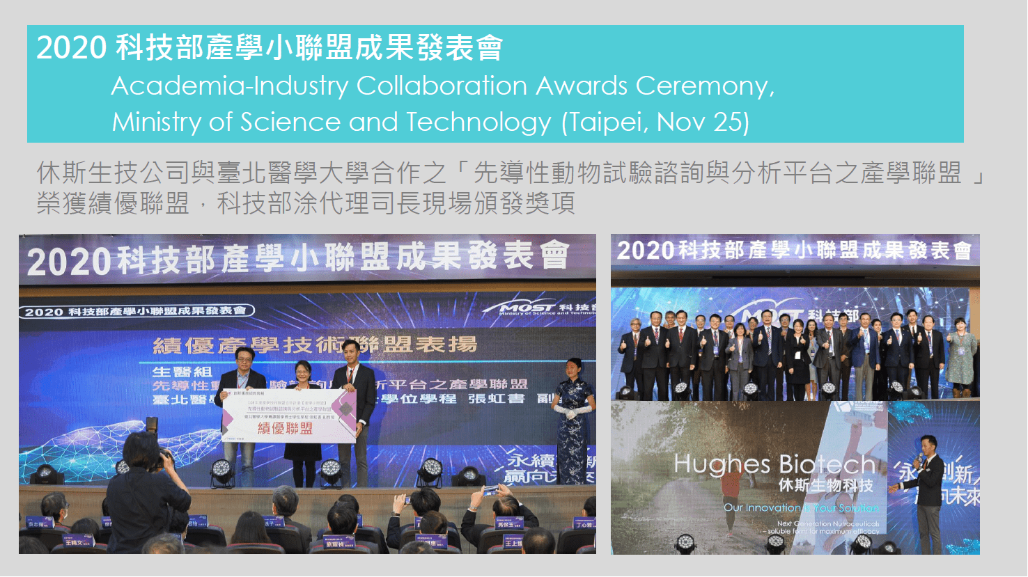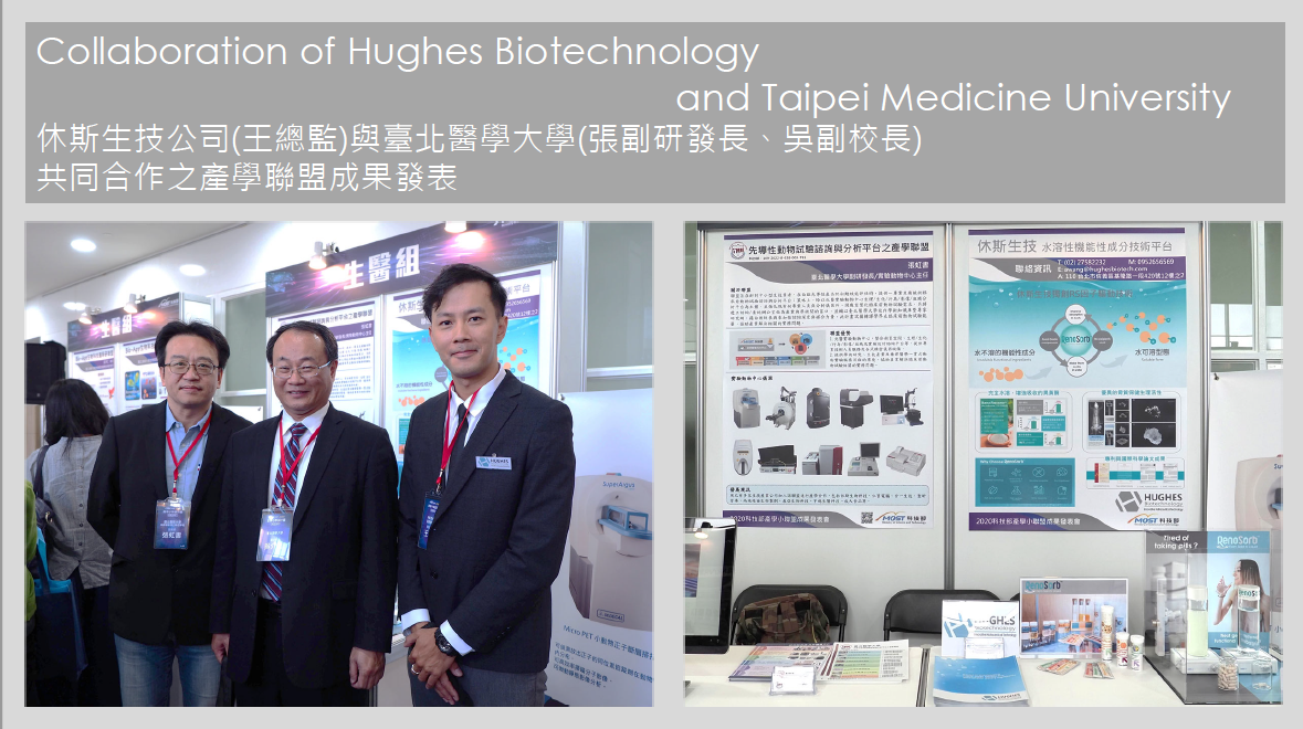 新聞發布科技部產學績優聯盟成果發表會 2020.11.24 休斯生技公司與臺北醫學大學合作之「先導性動物試驗諮詢與分析平台之產學聯盟 」獲2020科技部產學小聯盟之績優聯盟殊榮 BIO Asia-Taiwan 亞洲生技大會展出花絮 賀!休斯獲選SiTi臺北市產業發展獎勵研發補助計畫